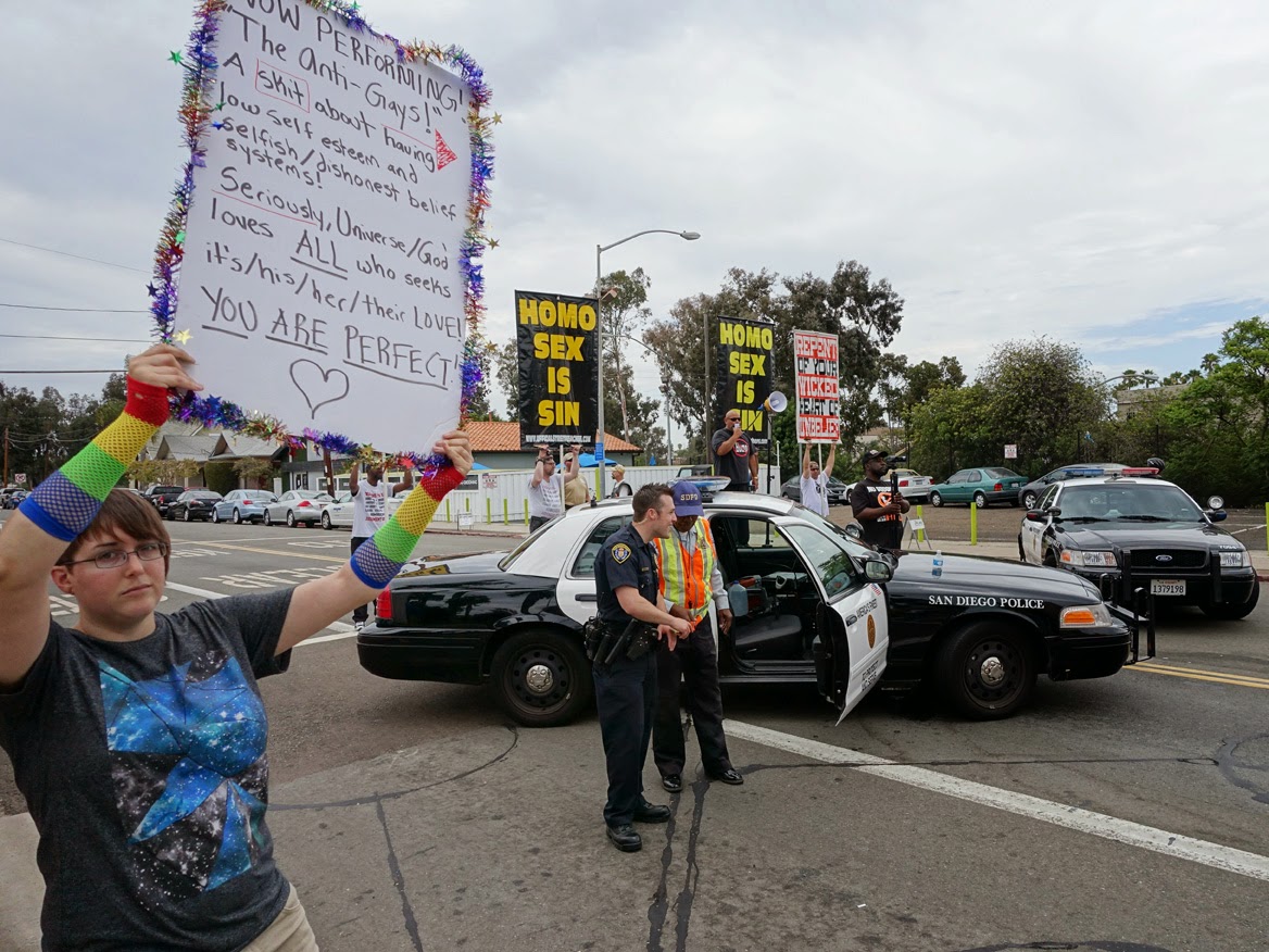 The annual Pride Festival celebrated families. I don't know the number, but there were thousands of happy people lining University Avenue and Sixth Avenue... except for half a dozen sad, unhappy people who claim to be "Christians" with direct communication from God who stood with giant signs and shouted their warning that LGBT people deserve "HELL" because "God Hates Gays." I particularly liked two quieter, lovelier people who stood serenely between the haters and the celebrating throngs with words that make real sense.